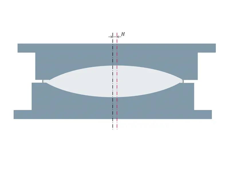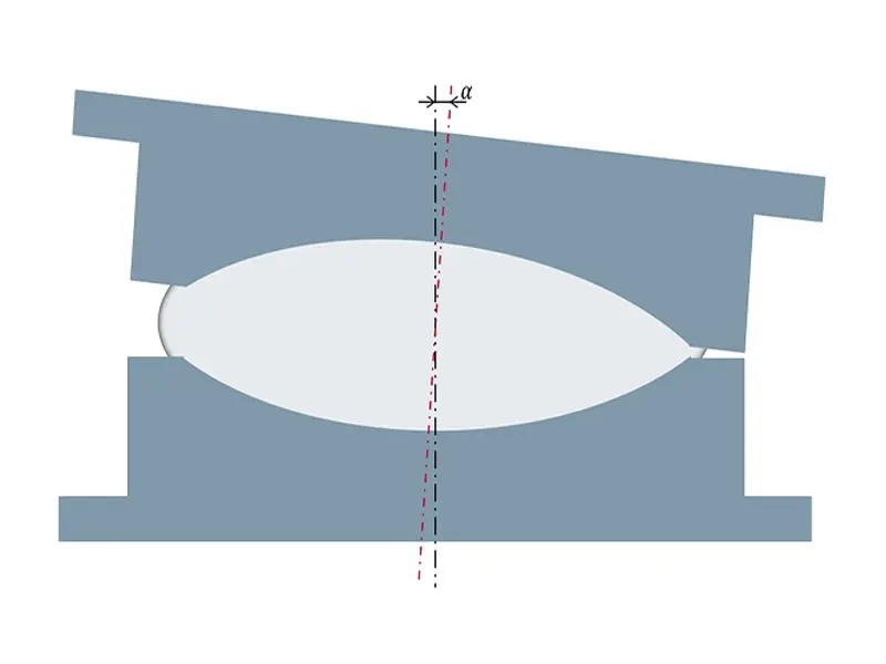 有两个因素对精确生产至关重要:一方面,引入到预期光学功能表面的每个半模中的负几何图形的准确度;另一方面,两个半模要相互对准。以这种方式制造的光学透镜出现任何对准误差都会导致透镜的两个相对的光学功能表面出现位置错误。然而,两个工具半模的相互对准只能在制造的工件(即光学元件)上进行检测。在光学生产中,倾斜和横向偏移等制造误差是普遍存在的问题。定心误差及其公差在 DIN ISO 10110 第 6 部分中有精确定义。