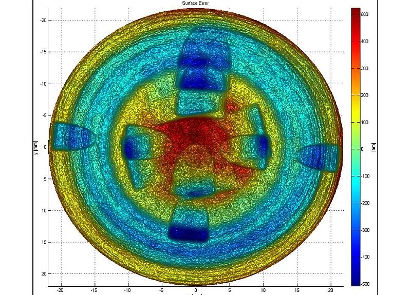 基于 Mach-Zehnder 原理的干涉仪甚至可以测量非常陡峭的非球面,同时可靠地检测出表面上的中高频误差。以短序列干涉图像测量整个镜头,用时大约 30 秒。综合所有光源的干涉测量图即可描绘整个非球面。由于 MarOpto TWI 60 可以测试坡度偏差高达 8°(就最接近球面而言)的非球面,测量系统特别灵活,并且可以适应多种非球面。