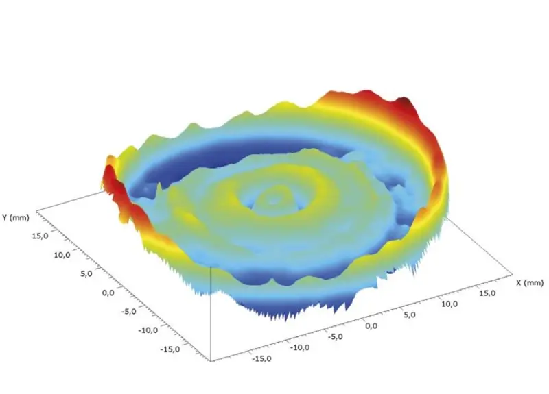对于 3D 测量,先测量透镜顶点偏移 90° 的两个直线轮廓。然后通过旋转 C 轴记录数个同心圆形轮廓。然后使用这些测量点生成表面特征轮廓。测杆的自由定位能力使得可以测量中断表面。